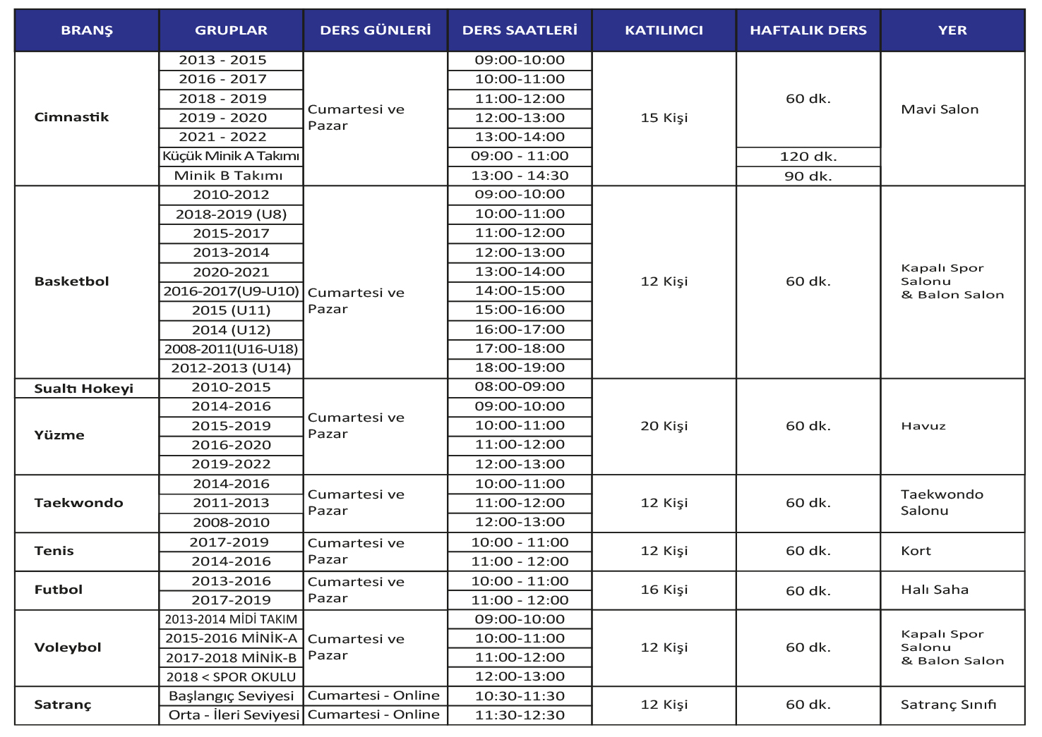 8- Kış spor okulu antrenmanlarımız hafta sonları 60'ar dk sürecektir. Sezon içerisinde sporcunun gelişimine yönelik grup değişikliği yapılabilmektedir.